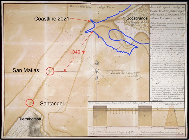 «Un grupo de investigación oceanográfica liderado por el Académico Carlos Alberto Andrade, publicó recientemente un artículo que describe el estado de la Escollera de Bocagrande, la muralla submarina que construyó España a finales del siglo XVIII para no permitir la navegación por esa entrada de la Bahía de Cartagena y el descubrimiento de las ruinas del Fuerte San Matías y de Santangel, que fueron sepultadas en parte por dicha Escollera.»
