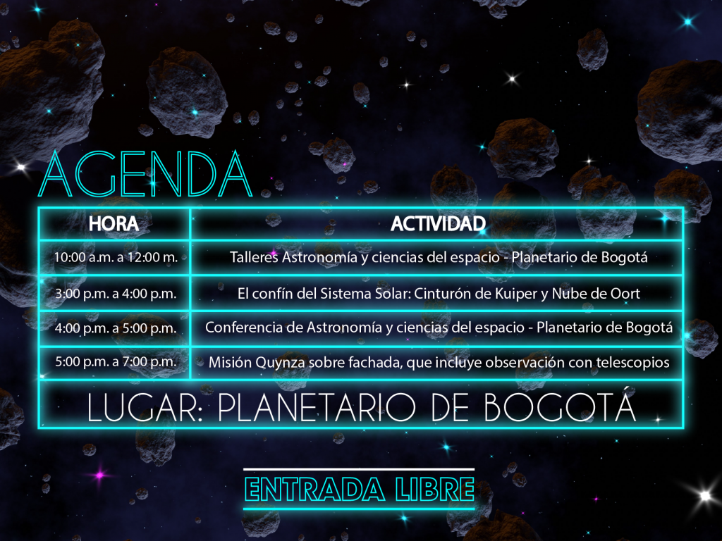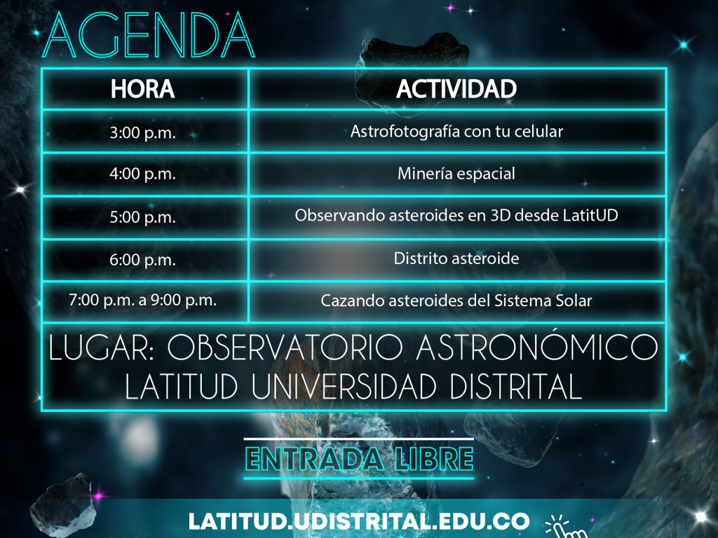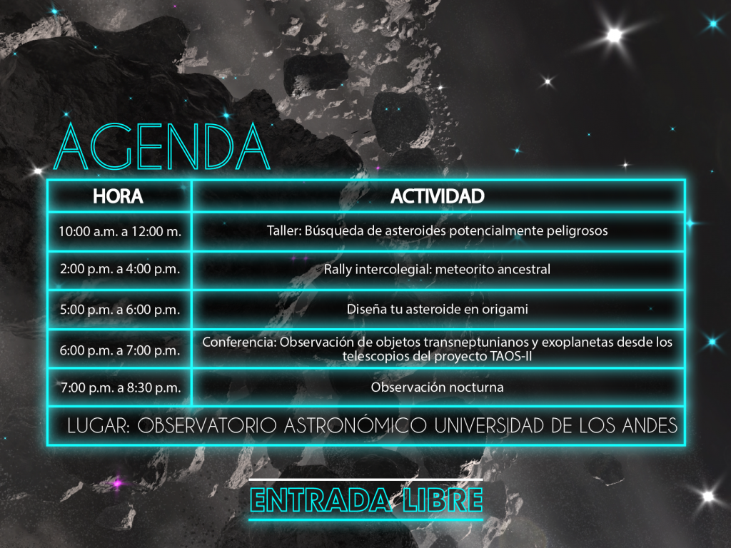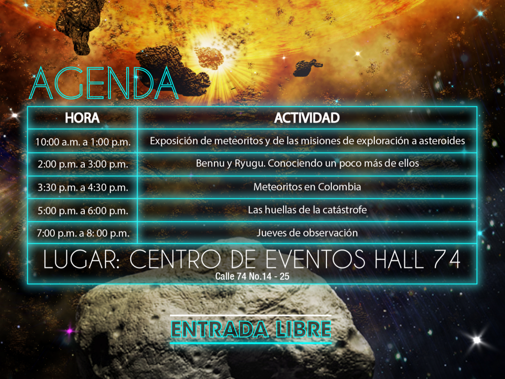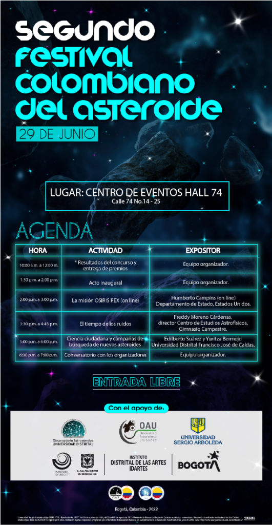 Durante la Jornada del 29 DE JUNIO del Festival Colombiano del Asteroide, se llevaran a cabo actividades de manera presencial en el Centro de Eventos Hall 74, Universidad Sergio Arboleda, y el 30 DE JUNIO las actividades seran presenciales y virtuales en cada una de las instituciones organizadoras del evento. A continuación toda la programación: