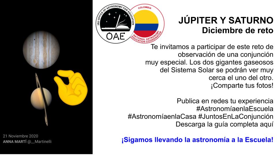 Acompáñanos este lunes 21 de diciembre a partir de las 5:00 pm, en el evento de lanzamiento de la Oficina de Astronomía para la Educación, OAE Colombia; actividad virtual donde compartiremos con diferentes grupos aficionados, académicos y profesionales de nuestro país, el fenómeno astronómico de la conjunción planetaria entre Júpiter y Saturno, el cual coincide con el solsticio de diciembre de este 2020; link: http://tiny.cc/OAE_Conjuncion