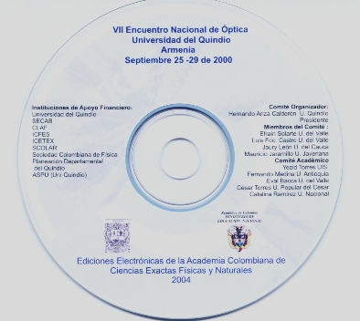 CD-ROM. Contiene los resúmenes de las conferencias y contribuciones hechas en el evento, además de los textos completos de algunas de ellas. Los interesados en obtener el CD-ROM (Col $ 25.000 + portes.) deben contactar a: revista@accefn.org.co |